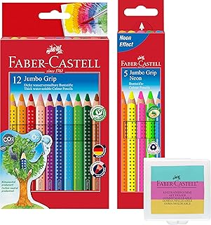 Faber-Castell Bundle 110912 Buntstift Jumbo GRIP 12er Kartonetui; inklusive Spitzer und Faber-Castell 110994 - Buntstifte Jumbo Grip Neon, 5-er Etui (Bundle neon + 12er bunt, 1)
