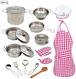Hearthrousy Küchenspielzeug Kinder Kochkostüm Set Kinderküche Kochgeschirr Edelstahl Pfannenset 18 Stück Küchenutensilien Set Küchenspielzeug mit Kinder Kochschürze Kochmütze Ofenhandschuh