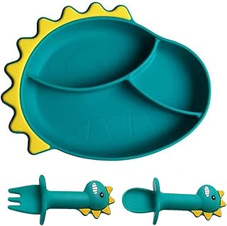 3-teiliges Baby-Fütterschüssel-Set, Löffel und Gabel, Cartoon-Dinosaurier-Motiv, aus Silikon, mit Saugnapf, für Kleinkinder und Kleinkinder (grün)